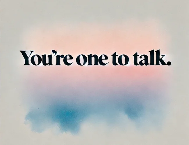 「You're one to talk」は、「それを言うならあなたも同じでしょう」「よく言うよ」といった意味で、相手に対する軽い皮肉や指摘を込めたフレーズです。